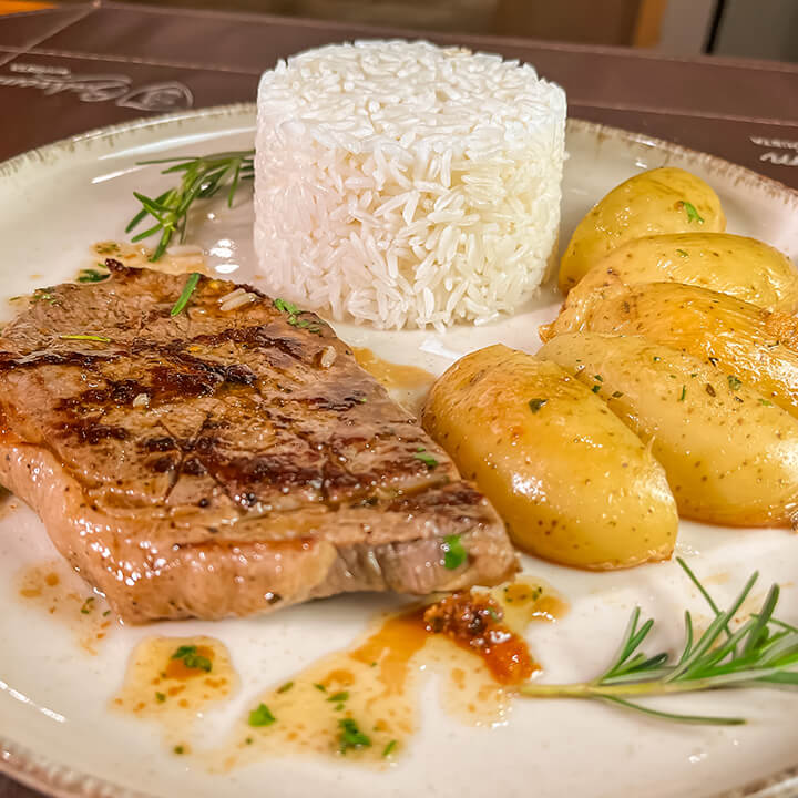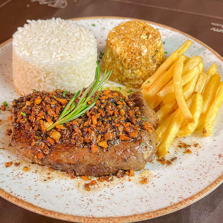 Ancho 200gr coberto com alho frito, arroz branco, farofa Bahrem e batata frita.
