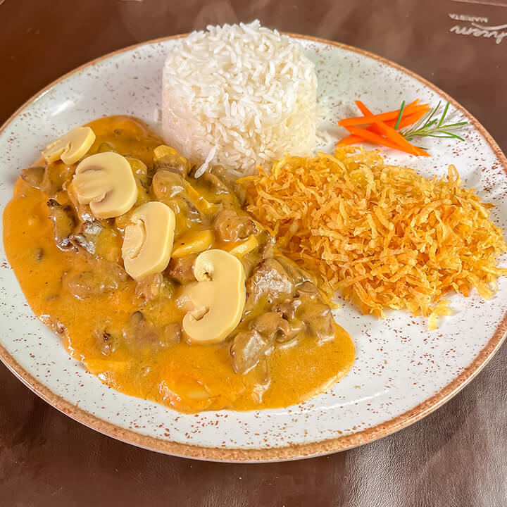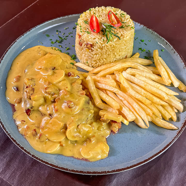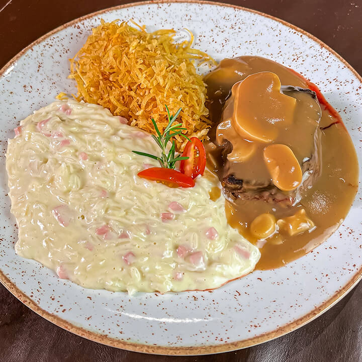 Medalhão de filet alto coberto com molho madeira, creme de leite, açafrão, bacon, champignon, arroz ao próprio molho e batata frita.