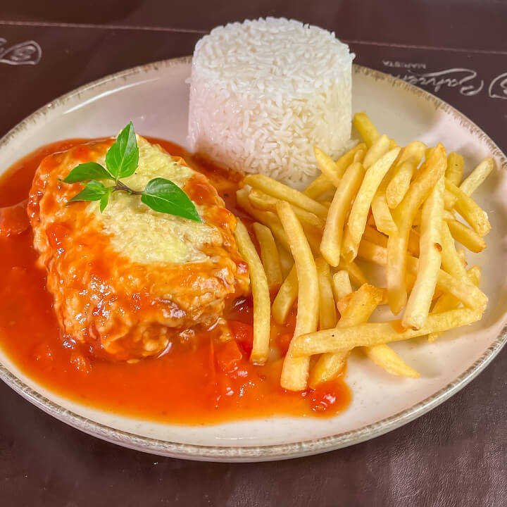 Filé empanado ao molho sugo gratinado com muçarela e parmesão. Acompanha arroz branco e batata frita.