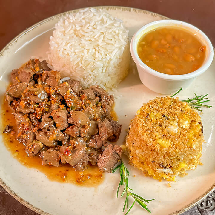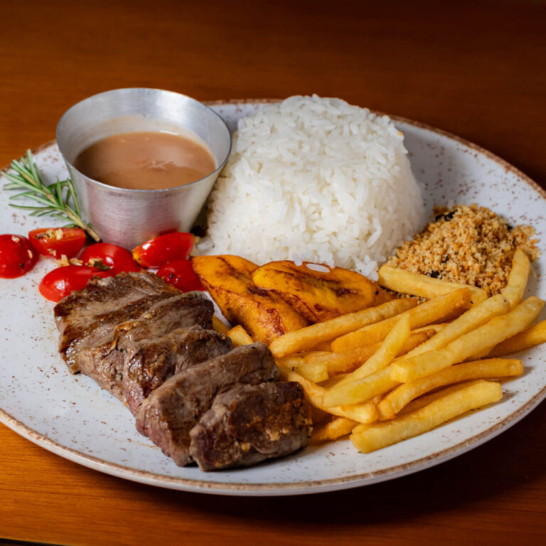 Tiras de filé mignon, arroz branco, batata frita, feijão de caldo, farofa bahrem, tomate cereja e banana frita.