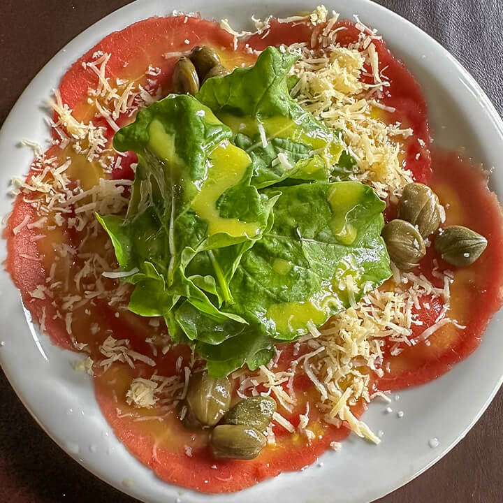 Versão de entrada do nosso Carpaccio com rúcula, queijo parmesão, molho de mostarda e alcaparras.