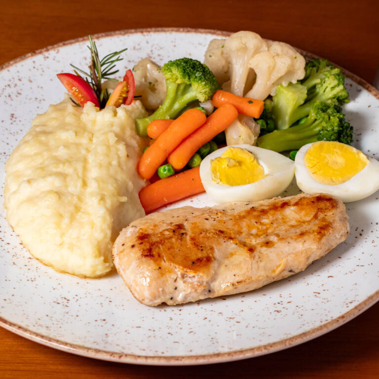 Filé de frango grelhado, purê de batata doce, legumes salteados e ovo cozido.