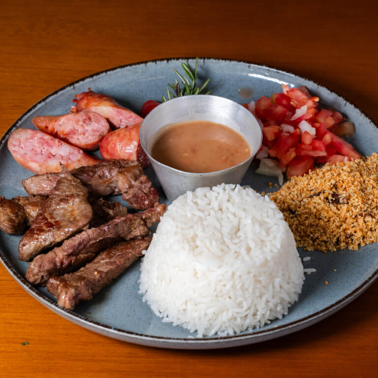 Alcatra e linguiça suína acompanhados de arroz branco, farofa, vinagrete e feijão de caldo.